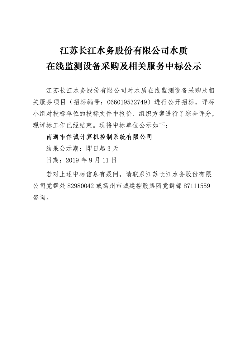 江蘇長江水務股份有限公司水質在線監(jiān)測設備采購及相關服務中標公示