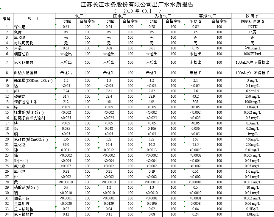 自來水水質(zhì)報(bào)告(2019年8月份)