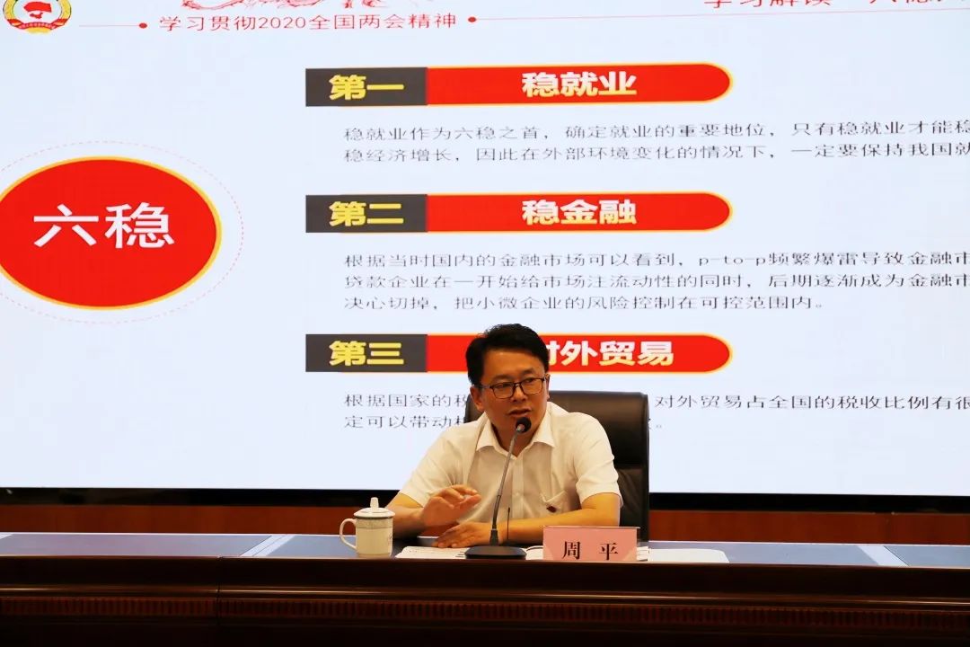 黨課從全國兩會(huì)為出發(fā)點(diǎn),圍繞“六穩(wěn)”“六?!眮碇v述政府的工作重心和工作重點(diǎn)的轉(zhuǎn)變,指出面對(duì)嚴(yán)峻挑戰(zhàn)時(shí),要堅(jiān)持穩(wěn)中求進(jìn)工作總基調(diào),堅(jiān)持新發(fā)展理念。
