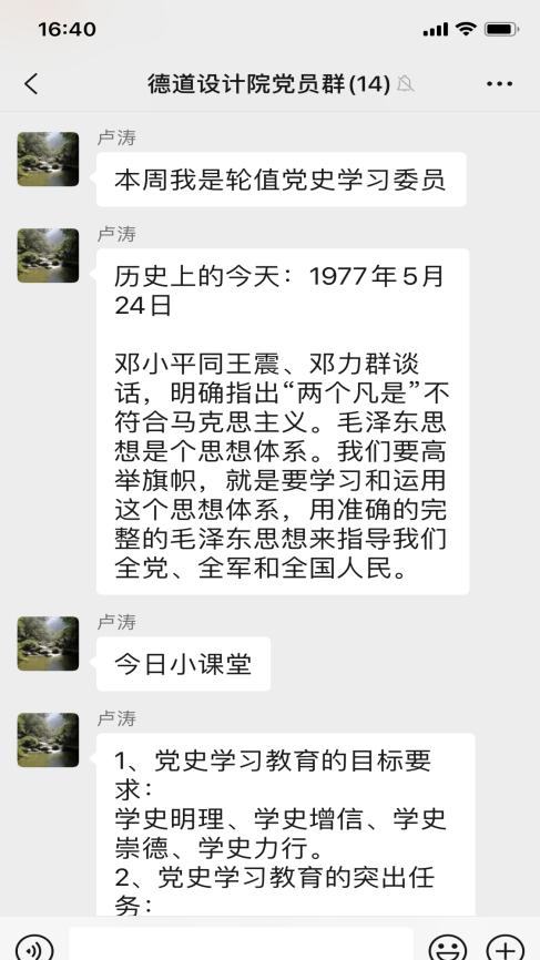 近日,為提升學(xué)史學(xué)習(xí)教育的實(shí)效性,設(shè)計(jì)院支部創(chuàng)新思路,結(jié)合工作的特殊性,以“黨員學(xué)習(xí)群”為載體,開展“輪值學(xué)習(xí)委員領(lǐng)學(xué)”活動(dòng),排出學(xué)習(xí)委員輪值表,支部委員帶頭,黨員跟上,每周由一名“學(xué)習(xí)委員”,帶領(lǐng)大家開展黨史線上學(xué)習(xí)。輪值學(xué)習(xí)委員在值班日當(dāng)天利用中午時(shí)間,通過微信群,“敲黑板、劃重點(diǎn)”,發(fā)布“歷史上的今天”和“今日小課堂”兩個(gè)版塊的學(xué)習(xí)內(nèi)容?!皻v史上的今天”展示了中國共產(chǎn)黨和新中國成立以來重大事件?!敖袢招≌n堂”每日推送三條黨史學(xué)習(xí)教育內(nèi)容,讓支部每個(gè)黨員在靈活時(shí)間內(nèi)完成學(xué)習(xí),汲取知識(shí)。