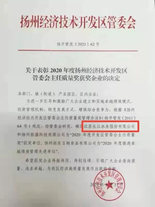 6月4日,揚(yáng)州市經(jīng)濟(jì)技術(shù)開發(fā)區(qū)召開全區(qū)質(zhì)量大會,表彰在質(zhì)量管理方面取得突出成效的企業(yè)組織,長江水務(wù)公司榮獲“2020年度開發(fā)區(qū)管委會主任質(zhì)量獎”。