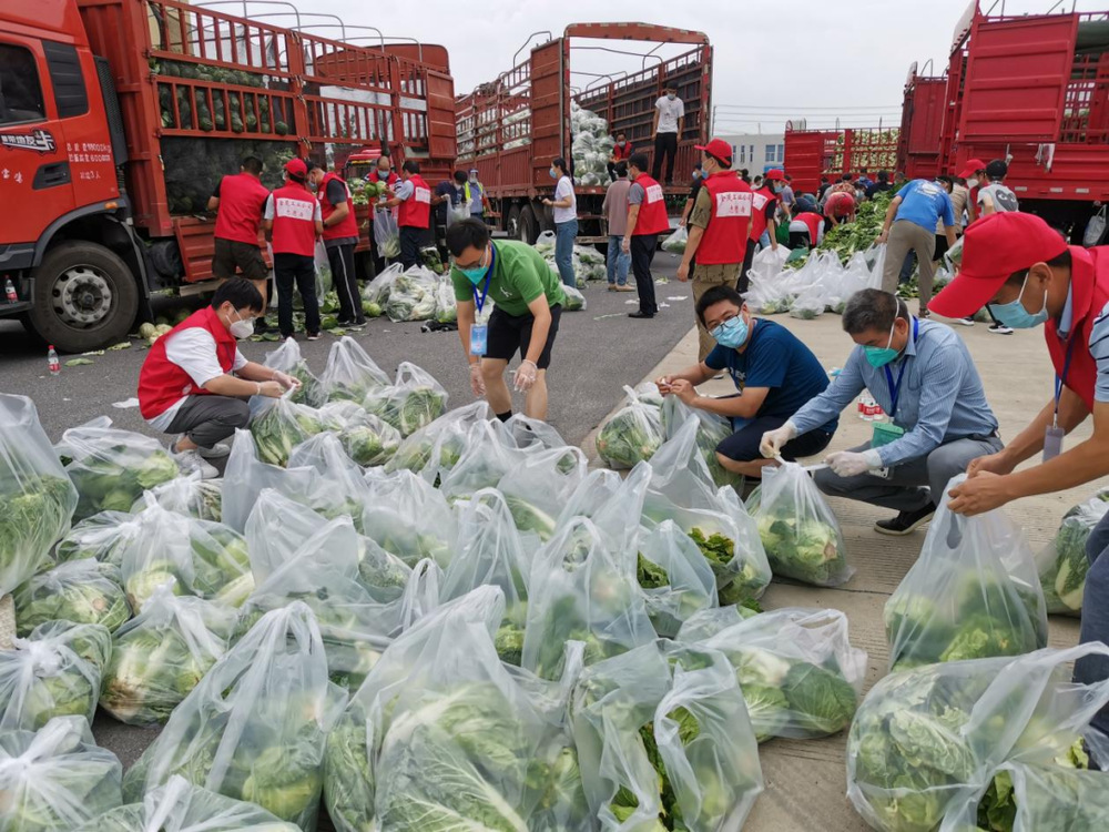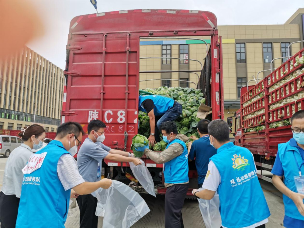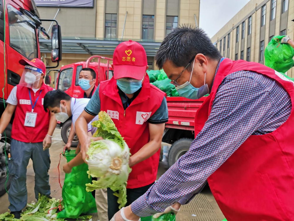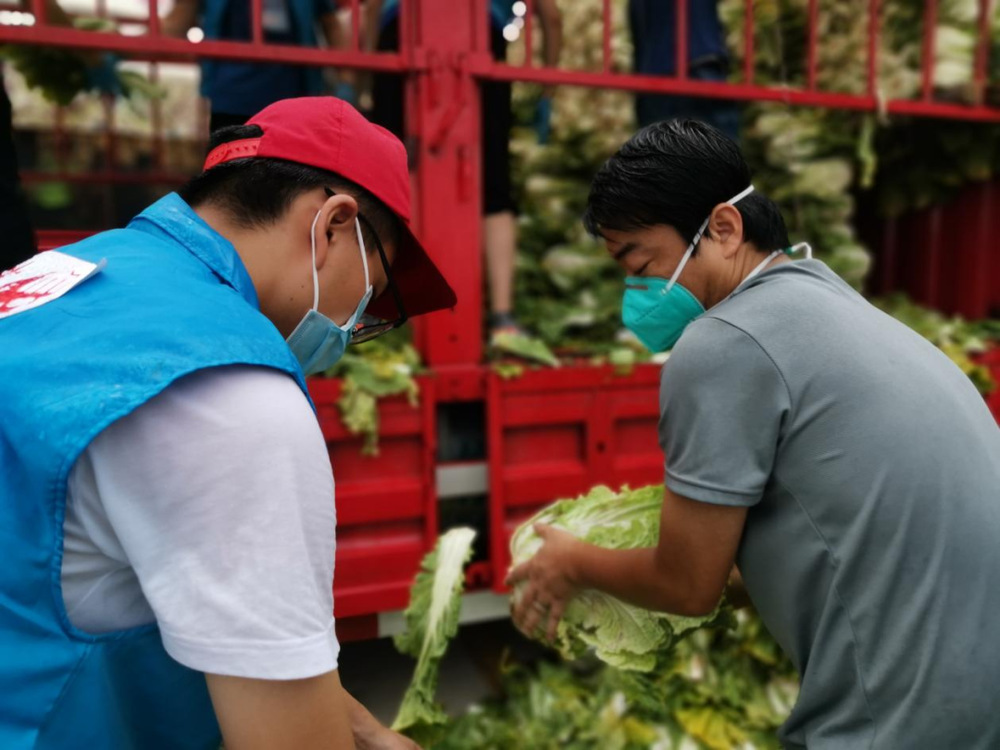 由于蔬菜數(shù)量龐大,為保障居民能夠及時拿到“愛心菜”,13:30,城控集團又從各志愿服務小組緊急抽調(diào)50名志愿者奔赴萬噸冷鏈進行現(xiàn)場支援。