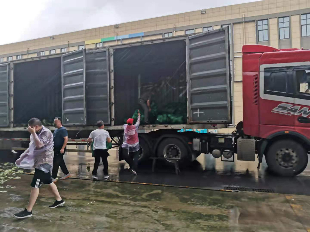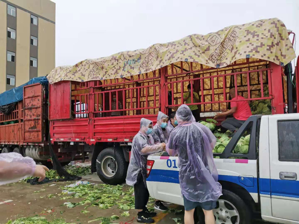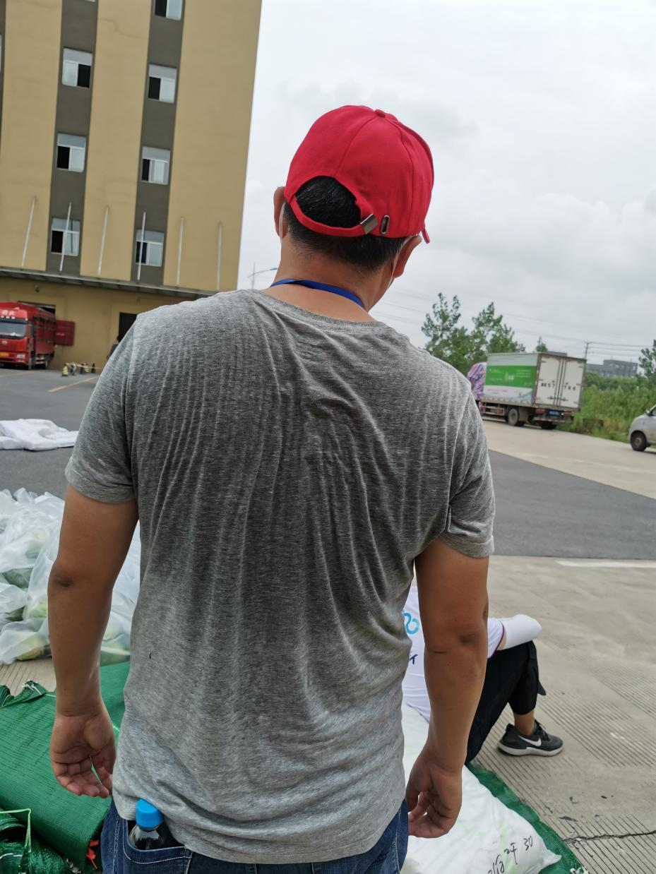 14:30,天空開始飄起雨點,大家依舊堅守在各自的崗位上,很快雨點就打濕了衣服和頭發(fā),可現(xiàn)場沒有一個人退下躲雨?!斑@車卸得差不多了,我們?nèi)ツ沁厧兔Α?,“邗江區(qū)轉(zhuǎn)運蔬菜的車來了,需要10個人裝車”,“我去”“我也去”,現(xiàn)場只有時不時這樣的聲音傳來。