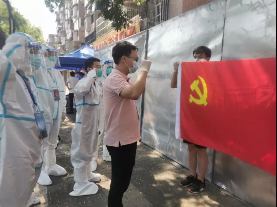 為更好地在抗疫一線發(fā)揮基層黨組織的戰(zhàn)斗力和黨員的先鋒模范作用,8月8日,第一批次出征高風(fēng)險(xiǎn)地區(qū)——武塘社區(qū)的志愿服務(wù)先鋒部隊(duì)經(jīng)集團(tuán)黨委批準(zhǔn),率先成立了抗疫志愿服務(wù)行動(dòng)臨時(shí)黨支部,讓黨旗第一時(shí)間飄揚(yáng)在疫情防控第一線。