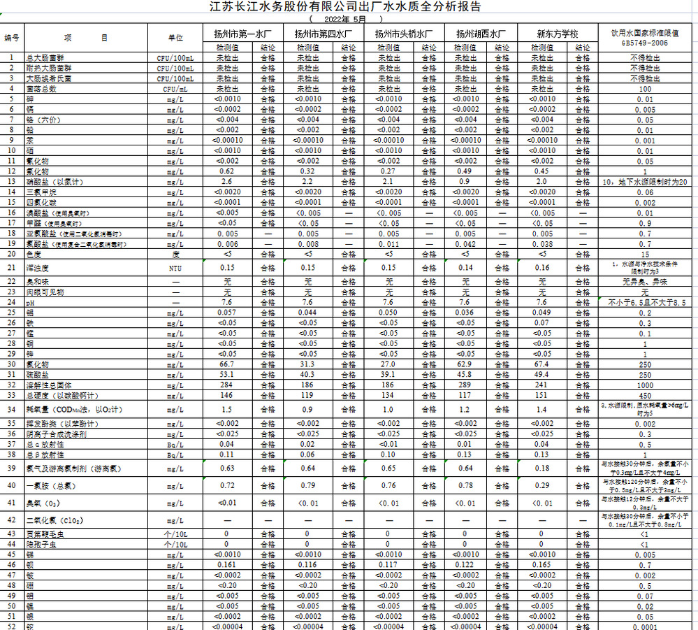 江蘇長江水務(wù)股份有限公司出廠水水質(zhì)全分析報(bào)告 ( 2022年 5月 )
