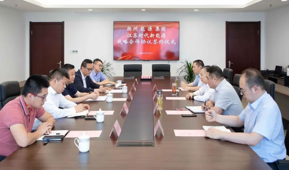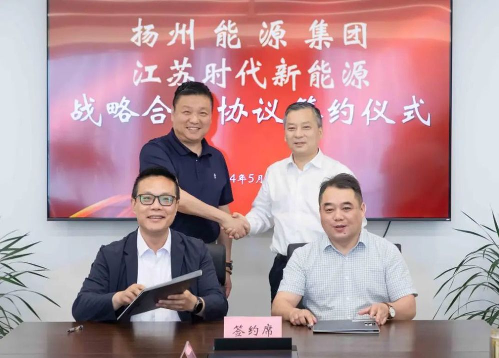 5月29日下午,揚州能源集團與江蘇時代新能源科技有限公司簽訂發(fā)展合作框架協(xié)議,城控集團副總經(jīng)理、能源集團董事長孔德存與寧德時代區(qū)域總經(jīng)理陳凌出席簽約儀式。