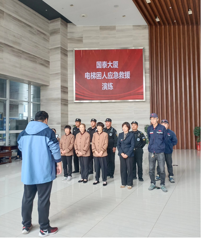 為進(jìn)一步增強(qiáng)業(yè)主乘坐電梯的安全防范意識(shí),提高突發(fā)事件的應(yīng)變能力,同時(shí)為提高物業(yè)工作人員處置突發(fā)事件的應(yīng)急能力,掌握突發(fā)事件的崗位職責(zé)和處理流程。10月11日上午,國(guó)泰大廈物業(yè)服務(wù)中心聯(lián)合電梯維保單位在國(guó)泰大廈2號(hào)樓開(kāi)展電梯困人應(yīng)急救援實(shí)戰(zhàn)演練。