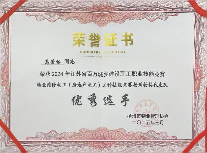 維修電工(房地產(chǎn)電工)工種技能競賽“優(yōu)秀選手 ”,高榮林同志,憑借出色的工作技能,在省級競賽“江蘇省百萬城鄉(xiāng)建設(shè)職工職業(yè)技能競賽物業(yè)維修電工(房地產(chǎn)電工)工種技能競賽”中榮獲“優(yōu)秀選手 ”稱號。這一榮譽(yù)稱號,不僅是對該名員工個人能力的認(rèn)可,更是對城建物業(yè)在員工培養(yǎng)與團(tuán)隊(duì)建設(shè)方面的肯定。