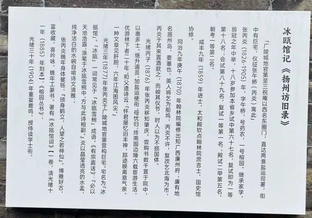 在揚州東圈門地官第12號,一座七進(jìn)七出的徽派建筑群靜靜矗立。這座名為“冰甌館”的宅邸,由清代進(jìn)士張丙炎于光緒三年(1877年)營建,其名取自“冰甌雪椀”的典故,既喻詩文清雅,亦暗含士人精神之純凈。作為晚清揚州文化史的重要地標(biāo),冰甌館不僅承載著張丙炎的生平軌跡與學(xué)術(shù)成就,更成為透視清代士大夫文化傳承與轉(zhuǎn)型的微觀樣本。