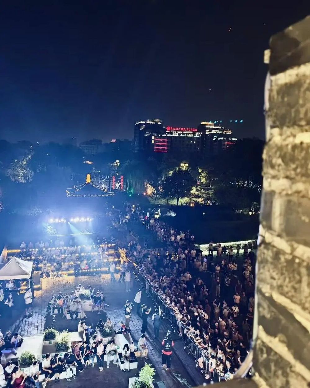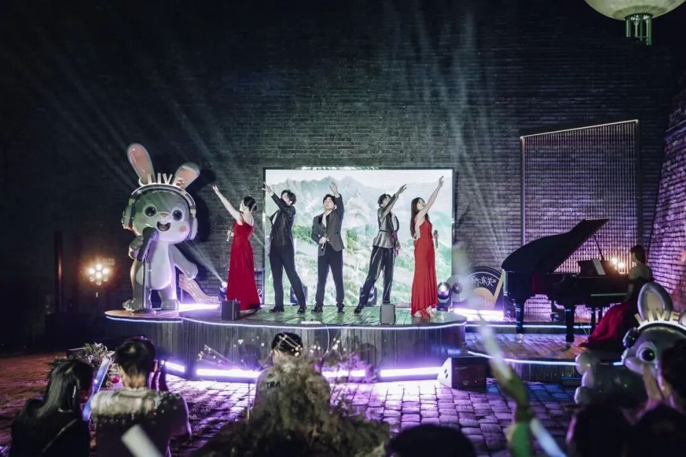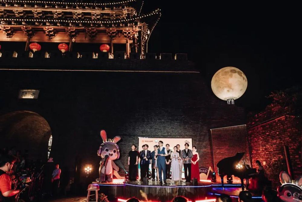 傍晚六點(diǎn)半,音樂(lè)會(huì)在主持人熱情洋溢的開(kāi)場(chǎng)中拉開(kāi)帷幕。在介紹完活動(dòng) “文旅賦能、文化碰撞、空間創(chuàng)新”的核心理念與到場(chǎng)嘉賓后,“紙鳶叩月?啟幕盛典” 儀式成為全場(chǎng)首個(gè)高潮——嘉賓們共同執(zhí)起 “時(shí)光之鑰”,叩響象征古今交融的 “時(shí)光月門”。伴隨主題旋律奏響,系著熒光絲帶的大紙鳶從東關(guān)城樓緩緩升空,嫦娥舞者輕盈起舞,冷焰火瀑布傾瀉而下,光影與音樂(lè)交織,瞬間將千年甕城化作連接歷史與當(dāng)下的 “音樂(lè)劇場(chǎng)”,正式宣告 “樂(lè)下東關(guān)” 微 Live 時(shí)光音樂(lè)會(huì)啟航。