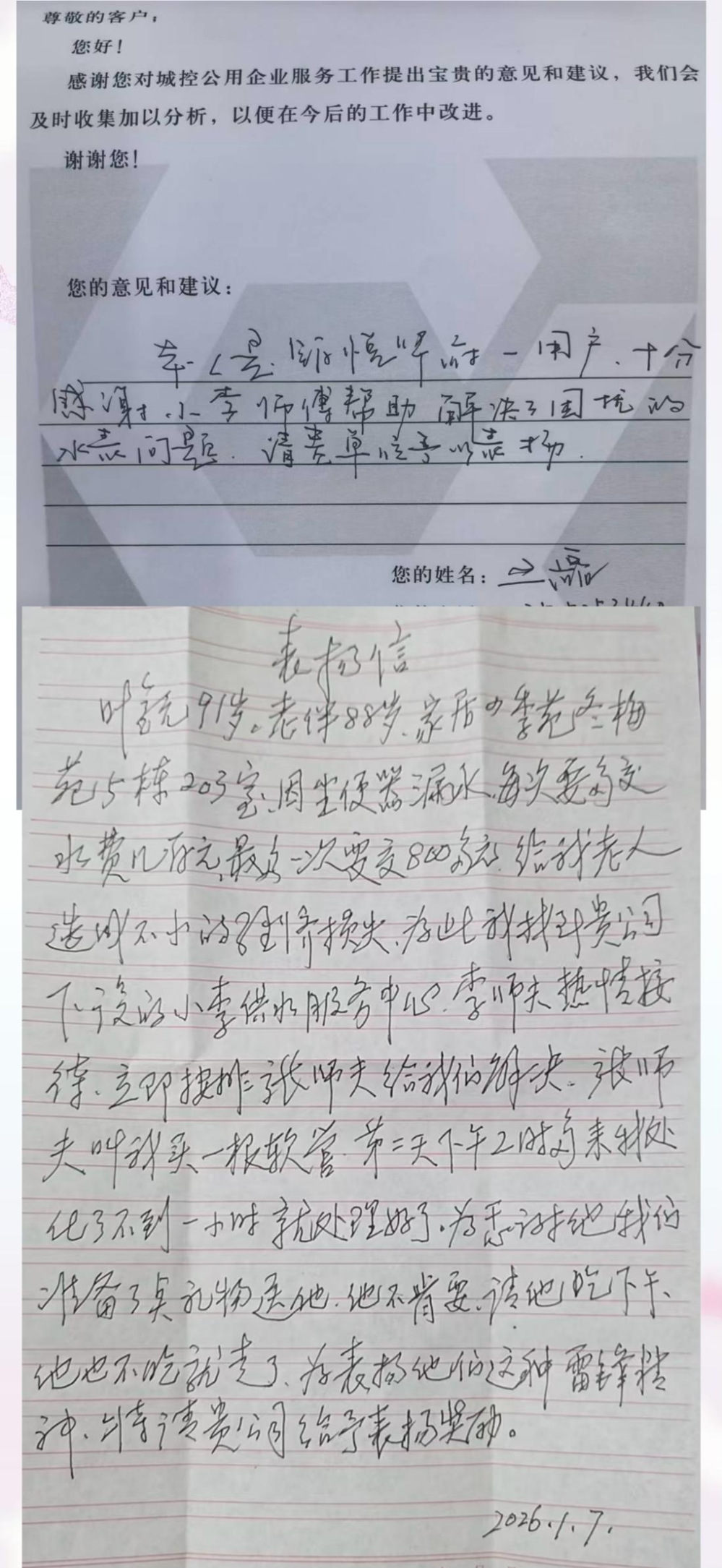 2025年12月10日下午及2026年1月7日,長江水務小李服務隊隊長李青同志及隊員,在文匯東路服務大廳先后收到兩位用戶的高度贊揚。用戶對服務隊專業(yè)高效、熱情周到的服務給予了誠摯肯定。