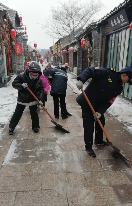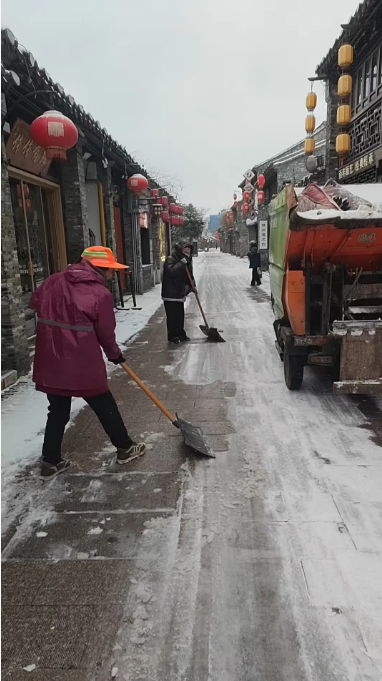 名城公司古城360志愿者服務(wù)隊(duì)迅速聯(lián)動街區(qū)商戶開展除雪保暢行動?,F(xiàn)場分工明確、協(xié)作高效。志愿者們手持鐵鍬、掃帚、除雪推板等工具,聚焦主街通道、陡坡路段和公共區(qū)域等關(guān)鍵節(jié)點(diǎn),奮力鏟除積雪、破除薄冰;商戶們們則以“門前三包”為基礎(chǔ),主動向外延伸清掃范圍,對門店前側(cè)街巷的積雪進(jìn)行細(xì)致清理。在志愿者們的帶動下,沿線特色文創(chuàng)店、餐飲商戶、手工作坊紛紛響應(yīng),大家迅速行動:有的搬出店內(nèi)儲備的鐵鍬、掃帚,有的巧用經(jīng)營優(yōu)勢,在門店前貼心設(shè)置“暖心補(bǔ)給點(diǎn)”,讓凜冽寒風(fēng)中的除雪現(xiàn)場涌動著陣陣暖意。