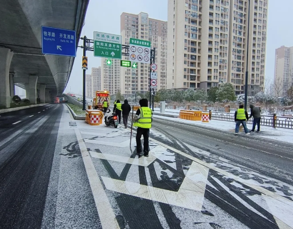 萬福公司在潤揚(yáng)快速路現(xiàn)場共投入應(yīng)急人員50余人,調(diào)配鏟車2臺及其他除雪物資若干,按照“機(jī)械為主、人工為輔、先急后緩”原則,有序?qū)D(zhuǎn)彎車道、上下匝道等重點(diǎn)區(qū)域進(jìn)行積雪清理,并同步實(shí)施防凍防滑處理。截至20日上午8時,地面輔路(含藍(lán)山莊園集散車道段)已全面開放交通,高架水馬等臨時設(shè)施也已全部撤離。
