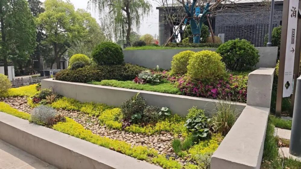 在項目設(shè)計中,充分考慮海綿技術(shù)與揚(yáng)州古城特色、 傳統(tǒng)園林景觀的有機(jī)結(jié)合,在保護(hù)歷史肌理的同時,形成“植物選型-空間敘事-功能協(xié)同-文化表達(dá)”的全鏈條設(shè)計。主要是:結(jié)合中式庭院景觀水池進(jìn)行雨水收集、儲留,降低雨水徑流,合理利用雨水;結(jié)合古城區(qū)傳統(tǒng)條石鋪裝,通過條石縫隙、碎石墊層形成透水路徑,降低地表徑流,補(bǔ)充地下水,緩解城市內(nèi)澇;結(jié)合場地高差設(shè)置階梯花池,最大限度收集周邊街巷雨水,實現(xiàn)雨水徑流消減和面源污染降低;沿河設(shè)置微凹綠地,過濾污染物,減少土壤侵蝕,保護(hù)水體生態(tài)。這一精細(xì)化設(shè)計不僅顯著提升了城市排水效率,有效緩解了內(nèi)澇風(fēng)險,更實現(xiàn)了雨水資源的自然積存、滲透與凈化,為揚(yáng)州古城打造出可持續(xù)的水生態(tài)系統(tǒng)。