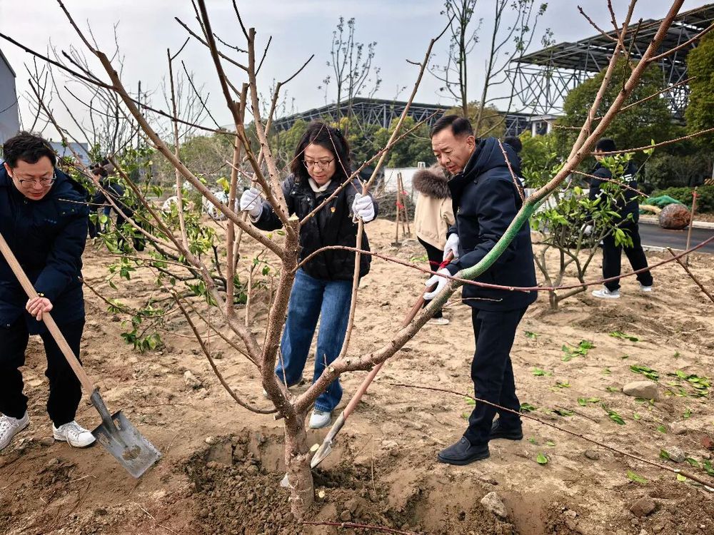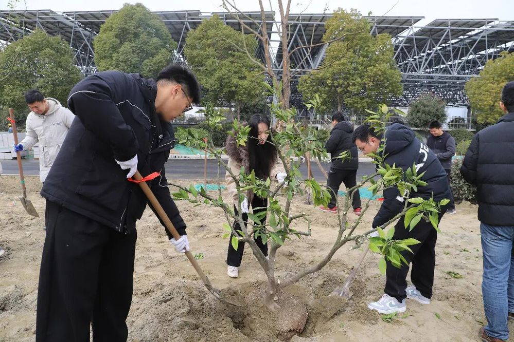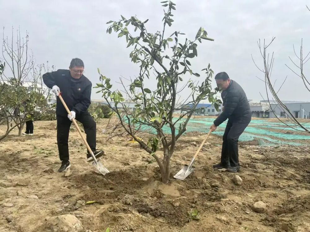 隨后,工作人員詳細講解了苗木種植要點、現(xiàn)場安全注意事項及分組安排,在領(lǐng)取鐵鍬、水桶、手套等工具后,大家迅速投入植樹作業(yè),扶苗、填土、壓實、澆水,每一個環(huán)節(jié)大家都配合默契、一絲不茍,保證每一棵桃樹苗都能規(guī)范栽種、落地生根,36棵苗木很快在六圩污水處理廠的土地上整齊挺立,為廠區(qū)增添了一抹盎然春意。