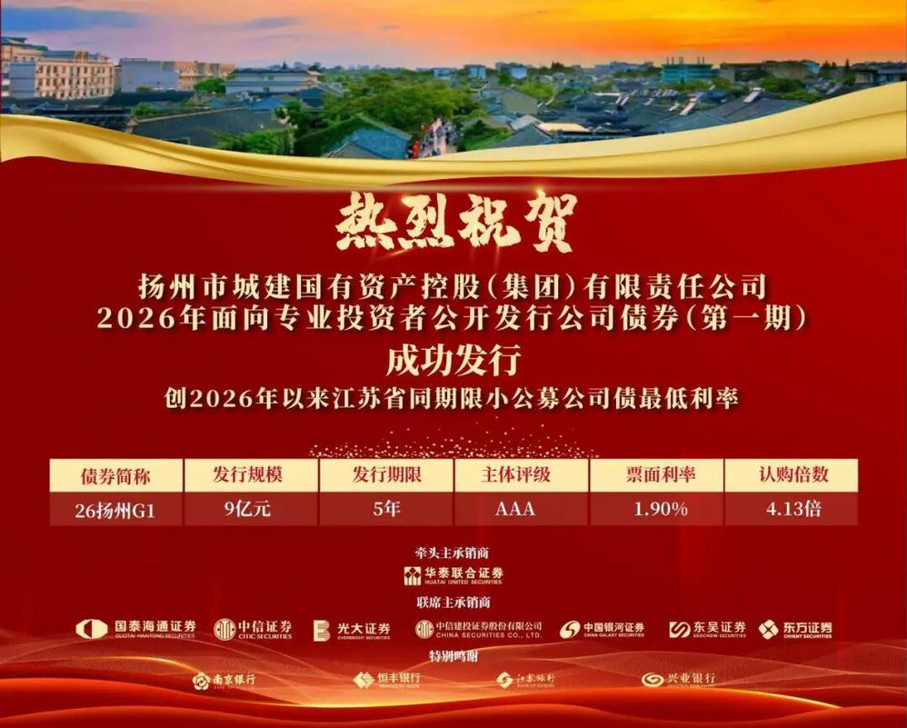 3月11日,城控集團成功發(fā)行9億元小公募公司債,期限5年,票面利率1.90%。本次發(fā)行再創(chuàng)城控集團中長期債券票面利率新低,同時刷新江蘇省2026年以來同期限小公募公司債最低利率。本次發(fā)行充分展現(xiàn)了資本市場對城控集團信用資質(zhì)、綜合實力與發(fā)展前景的認可。